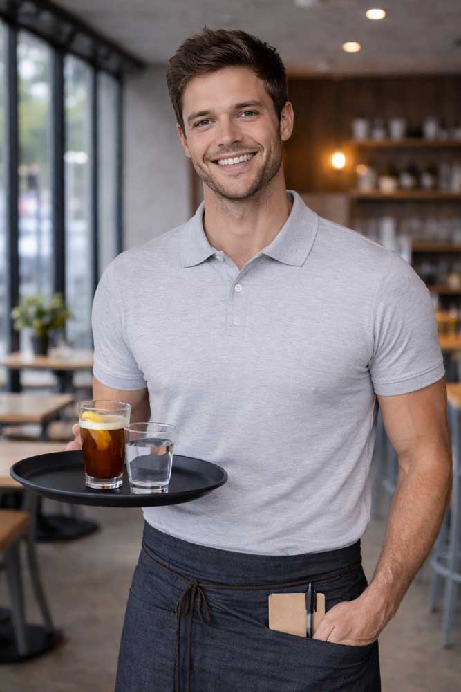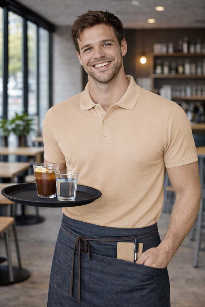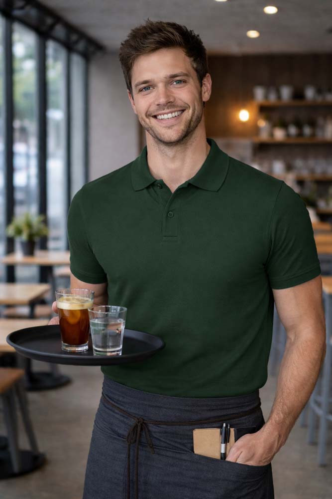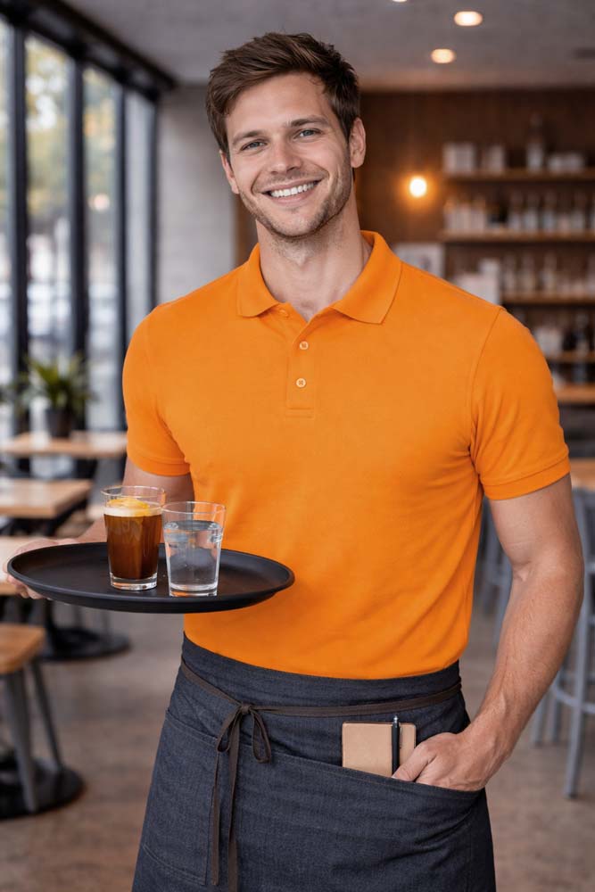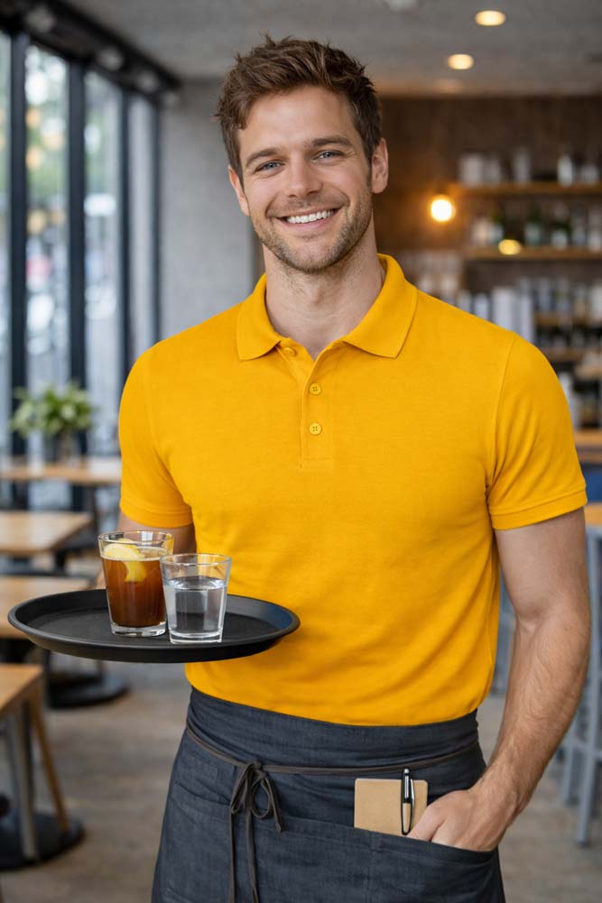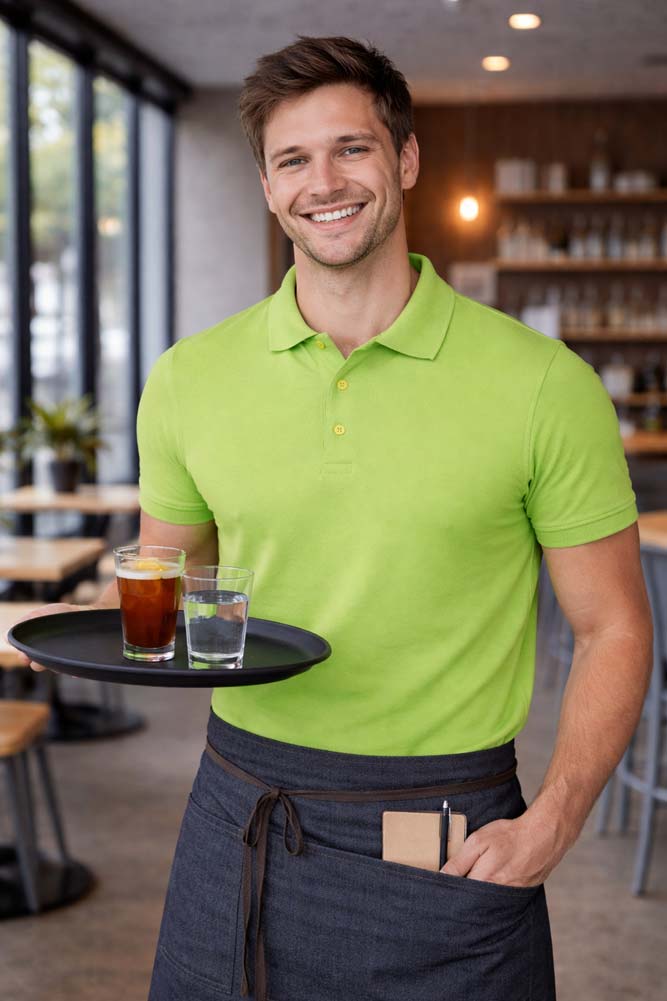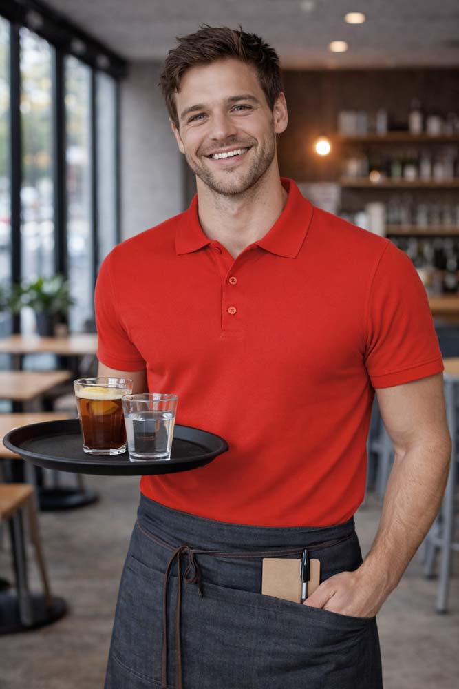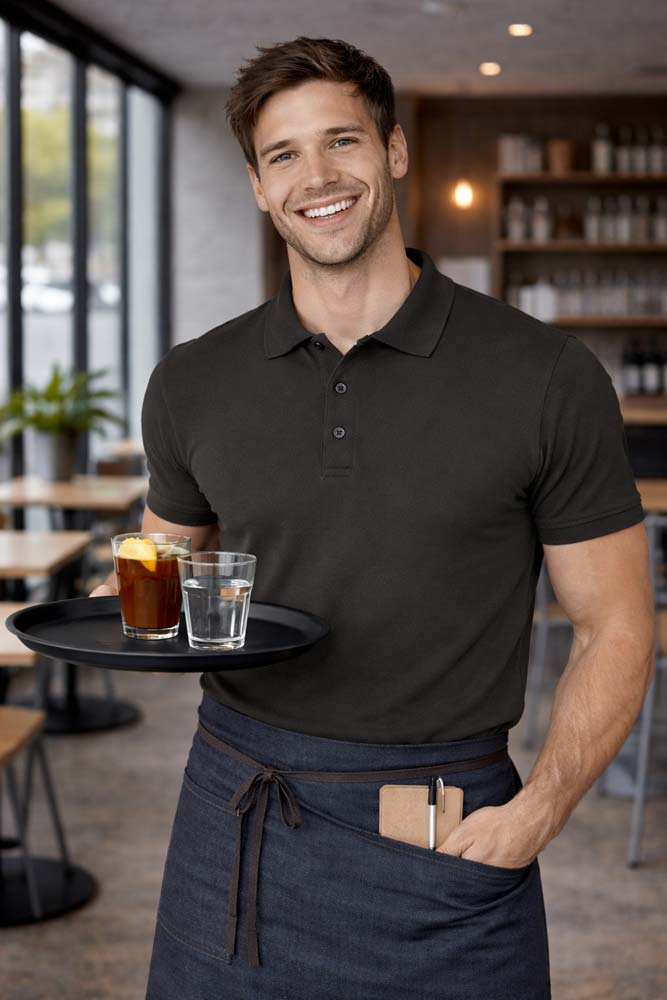 Kakovostna polo majica za HoReCa sektor iz 100 % česanega bombaža (220 g/m²), ki zagotavlja udobje, vzdržljivost in profesionalen videz. Ojačan ovratnik, dvojni šivi in stranski razporki omogočajo vsakodnevno uporabo v gostinstvu, hotelih, restavracijah in cateringu. Primerna za pranje do 60 °C.