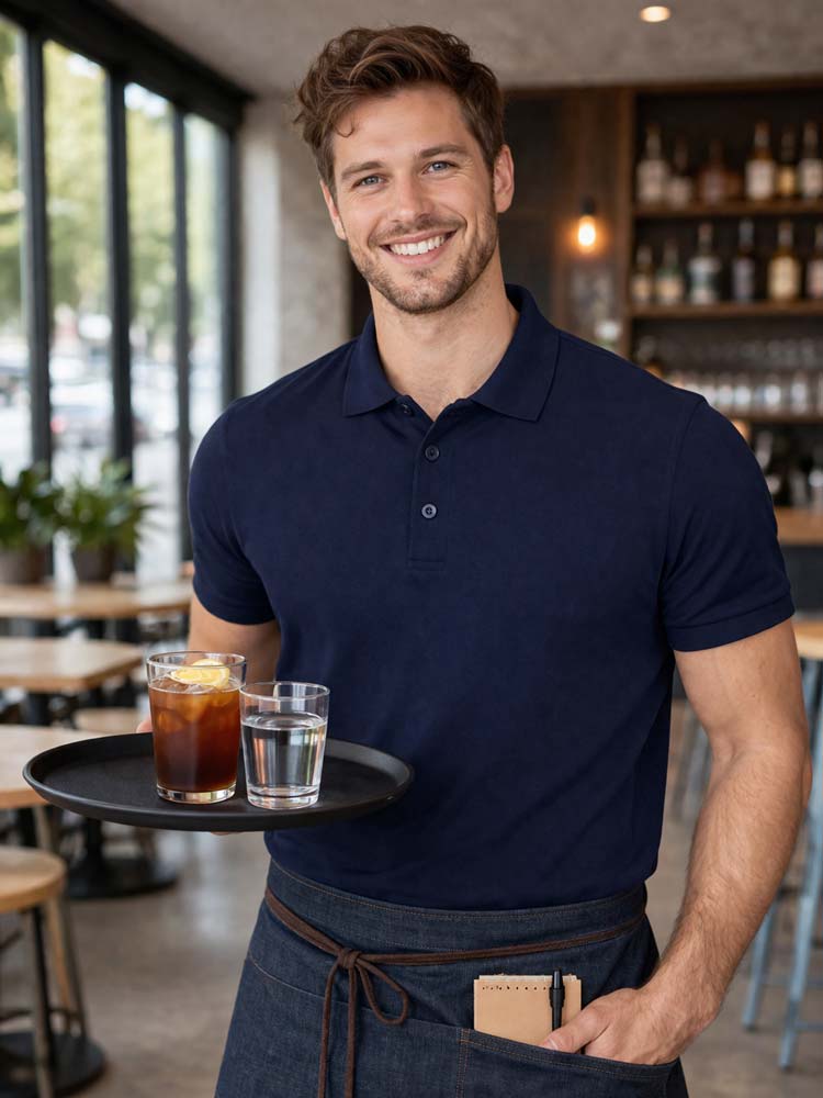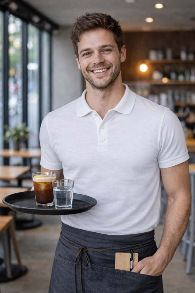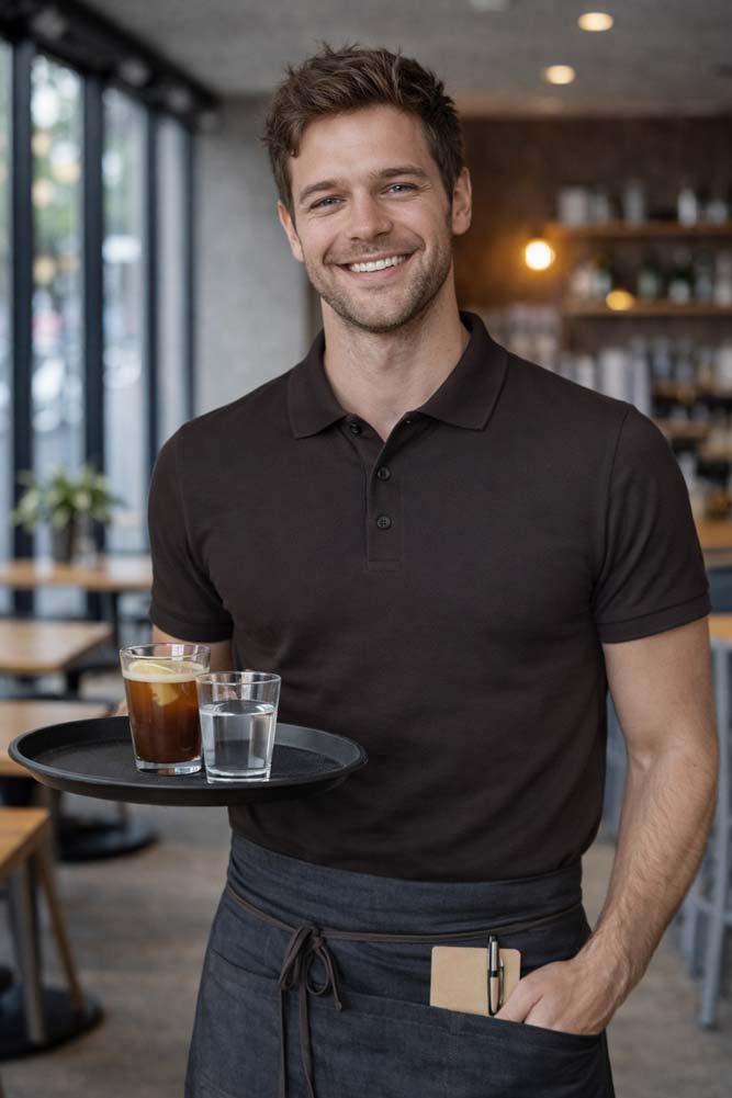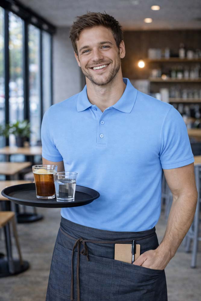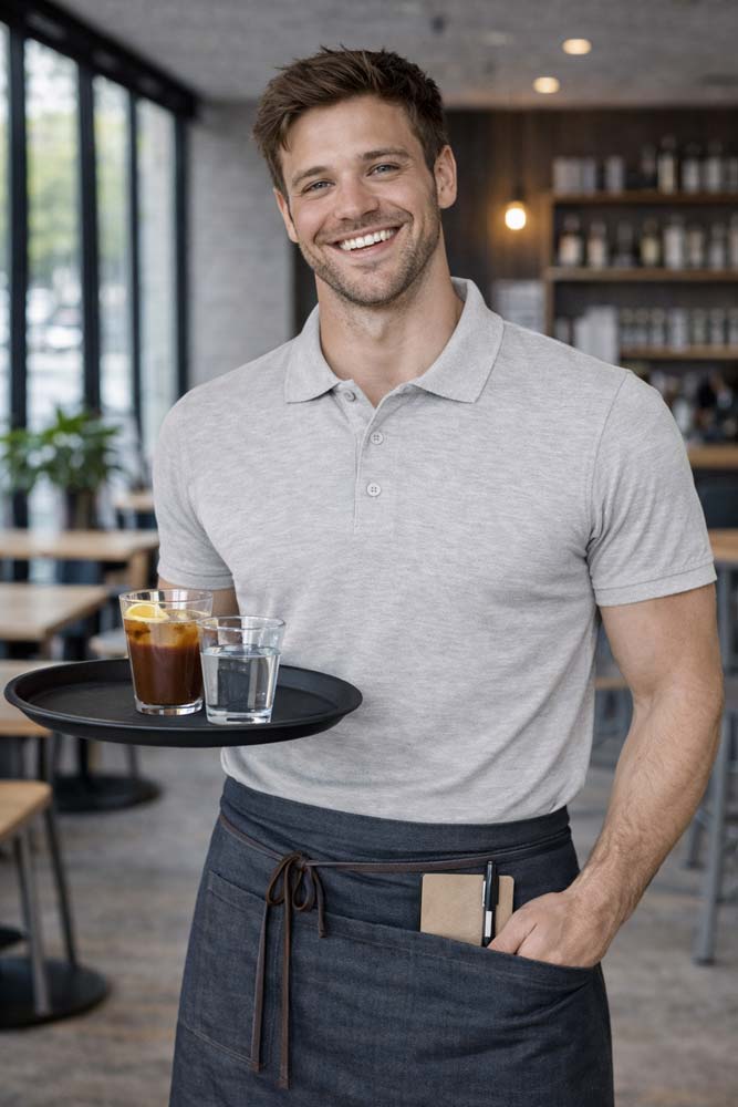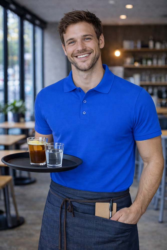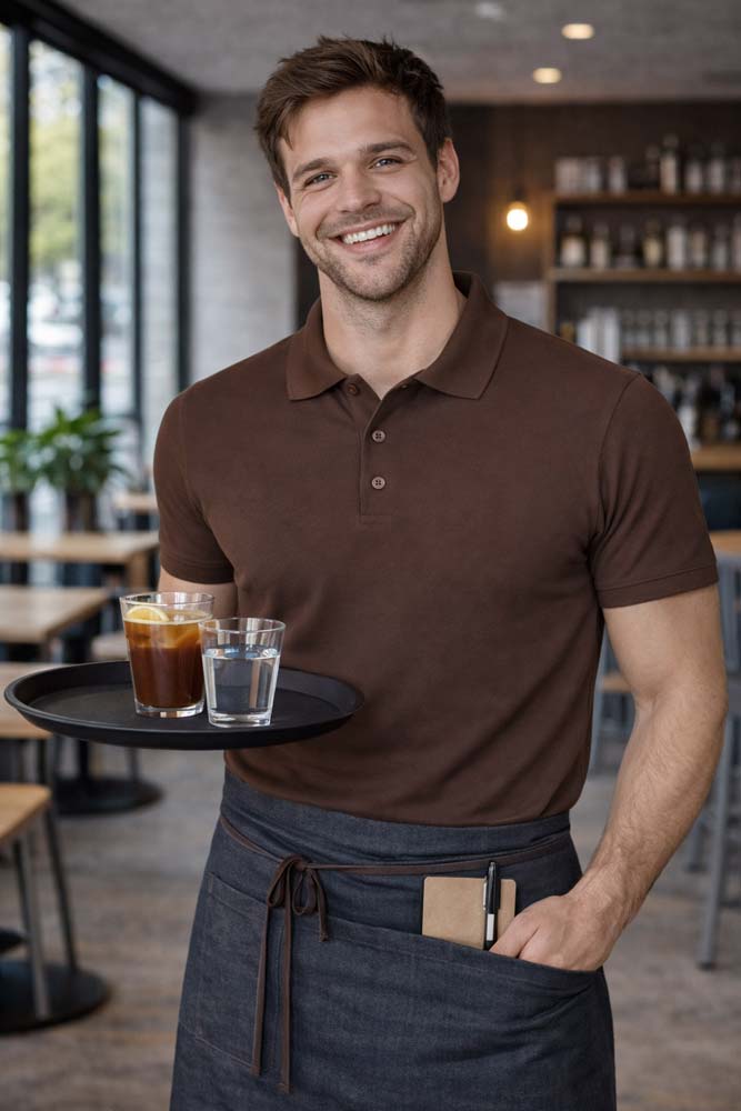 Kakovostna polo majica za HoReCa sektor iz 100 % česanega bombaža (220 g/m²), ki zagotavlja udobje, vzdržljivost in profesionalen videz. Ojačan ovratnik, dvojni šivi in stranski razporki omogočajo vsakodnevno uporabo v gostinstvu, hotelih, restavracijah in cateringu. Primerna za pranje do 60 °C.